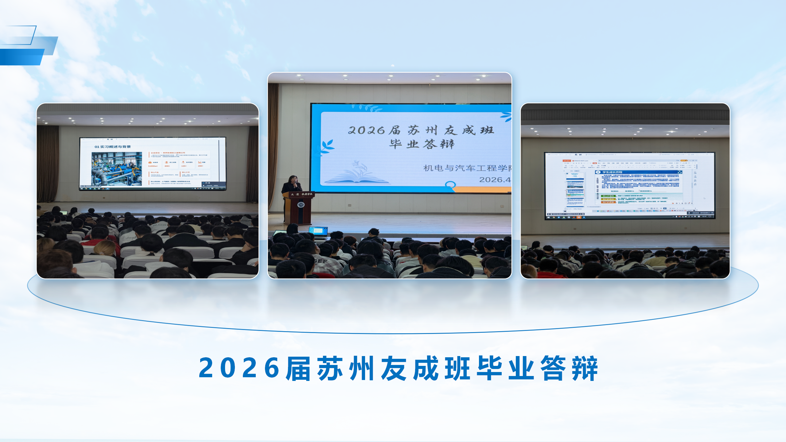 为帮助在校生提前认知岗位实习要求、明确专业学习方向,4月22日,机电学院组织开展2026届“苏州友成班”毕业答辩观摩活动,2024级全体学生在报告厅通过腾讯会议平台现场观摩学习。活动伊始,苏州友成机工有限公司(以下简称“友成机工”)人力资源对2024届学生实习情况进行全面总结,高度评价了校企协同育人的阶段性成果,重点赞扬了本届毕业生在项目实践能力与职业素养方面的突出表现,并寄语在场在校生:“珍惜校园与企业双重课...