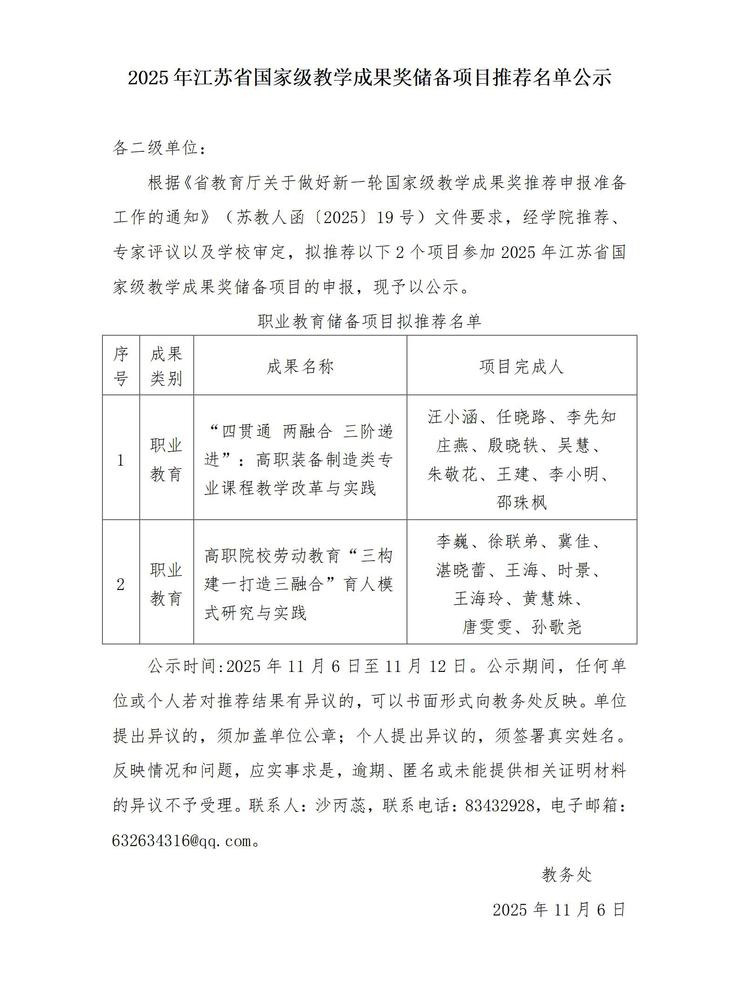 公示:2025年江苏省国家级教学成果奖储备项目推荐名单公示