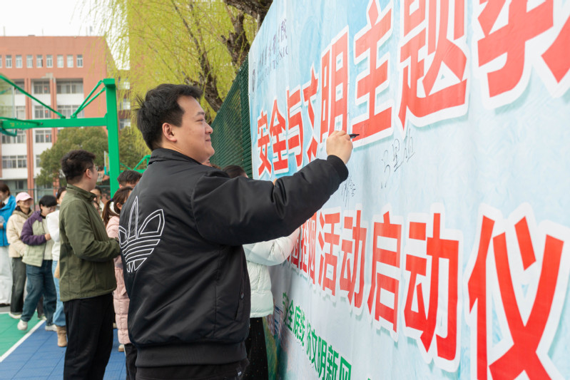 仪式最后,与会领导与师生代表在主题喷绘和控烟条幅上集体签名,郑重承诺践行安全文明理念、支持控烟工作。此次仪式标志着我校2026年春季学期安全文明主题教育及校园控烟专项行动正式拉开帷幕,为构建更高水平的平安校园、文明校园注入了新动力。