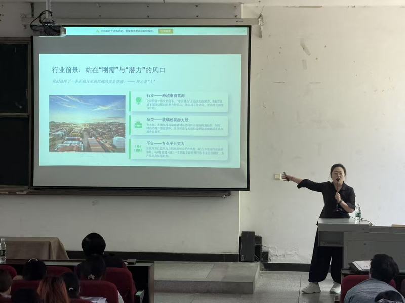 企业宣讲环节,来自徐州跨境电商产业园的徐州阿鲤鲤文化传媒、江苏国科深算科技、徐州嘉得乐文化传媒、徐州璞石传媒及徐州润园玻璃制品有限公司等五家企业代表依次发言,结合自身领域开展特色宣讲,例如阿鲤鲤文化传媒分享了短视频引流与海外账号运营实操技巧;国科深算科技解读了计算机、大数据等专业人才的需求标准及晋升路径;其余企业则围绕数字传媒策划、品牌推广、跨境玻璃制品贸易等领域,详细介绍了人才需求及就业创业扶持政策,并现场公布实习岗位招募计划。互动环节中,企业代表耐心解答了同学们关于专业适配、薪资待遇、创业合作等疑问,现场气氛热烈。