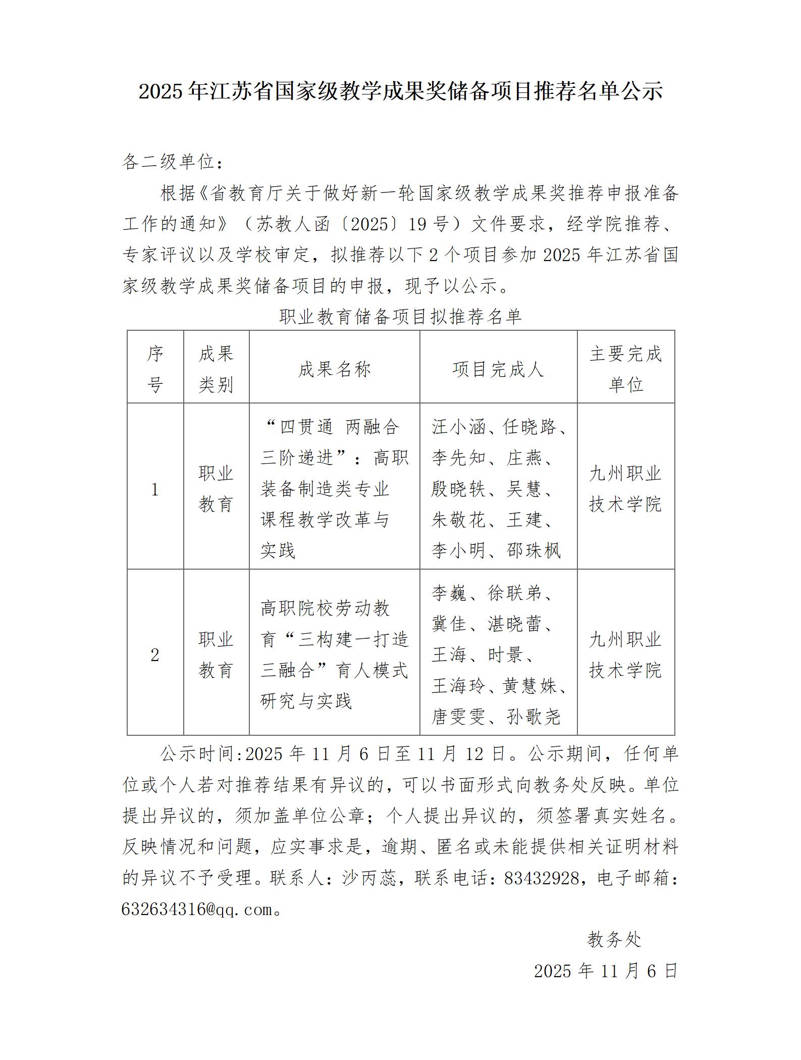 公示:2025年江苏省国家级教学成果奖储备项目推荐名单公示