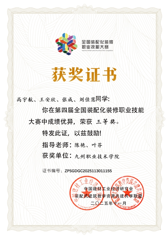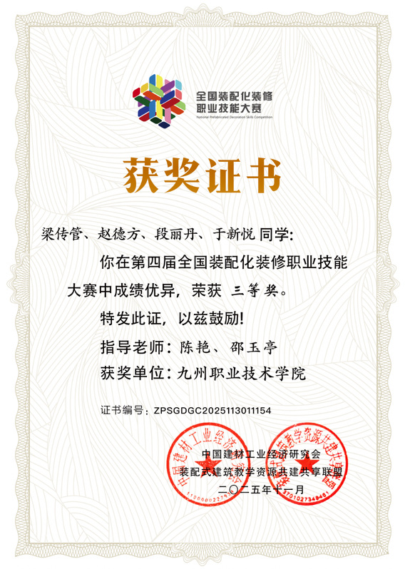 11月1日,第四届全国装配化装修职业技能大赛在浙江工业职业技术学院圆满落幕。在来自全国86所院校280支队伍参加比赛,由我校建筑工程与设计学院陈艳带队,陈艳、邵玉亭、叶芬、杨雪四位老师指导的12名学生组成的3支参赛队伍脱颖而出,荣获三等奖3项!