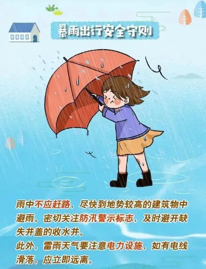 密切关注天气预报与预警信息,雷雨天气避免在树下、广告牌、供电线路附近逗留。注意使用合适雨具,确保视线清晰。如遇台风、暴雨等极端天气,请远离湖边、工地等危险区域,避免登山、骑行,提高防灾避险意识。
