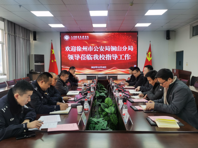 为进一步筑牢校园安全屏障,优化安全管理机制,12月10日下午,徐州市公安局铜山分局副局长戚传峰率治安大队、内保大队和保安服务公司负责人及铜山派出所干警一行来校,就2025年度校园安全管理工作开展专题调研并座谈交流。学院党委副书记张超接待调研组,党政办公室、后勤保卫处、学生工作处等部门负责人参与会议。