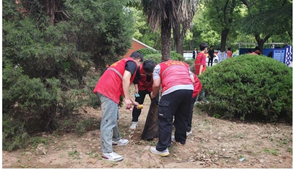 合照结束后,两个学院的同学们分别前往各自负责的区域开展清扫工作。机电学院的同学们负责清扫捡拾教一楼前花坛内的垃圾。大家手持清扫工具,认真细致地清理着花坛里的每一处角落。无论是隐藏在草丛中的落叶,还是被丢弃的塑料瓶、包装袋等,都被一一捡起。同学们不怕脏、不怕累,用实际行动诠释着环保精神。他们分工明确,有的负责清扫,有的负责收集垃圾,现场秩序井然。
