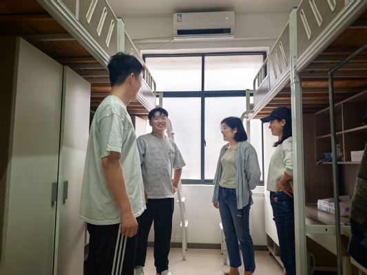 慰问组一行首先来到学生宿舍值班室。任晓路书记与值班员们亲切交流,对他们舍小家、为大家,在国庆佳节期间依然恪尽职守、默默奉献,全力保障校园生活平稳运行表示衷心的感谢。任书记表示,宿舍值班员是校园安全稳定的“前哨”,更是学生日常生活的“贴心人”,他们的辛勤付出为学院营造安全、和谐、温馨的育人环境奠定了坚实基础。随后,慰问组探望了部分留校学生。“假期有什么安排?”“学习和生活上有没有什么困难?”任书记与同学们愉快长谈,细致地询问他们的学习进展、生活状况和假期规划,并叮嘱同学们要劳逸结合,既要珍惜时光、完成好学业任务,也要注意人身与财产安全,时常与家人联系报平安,度过一个充实而有意义的假期。