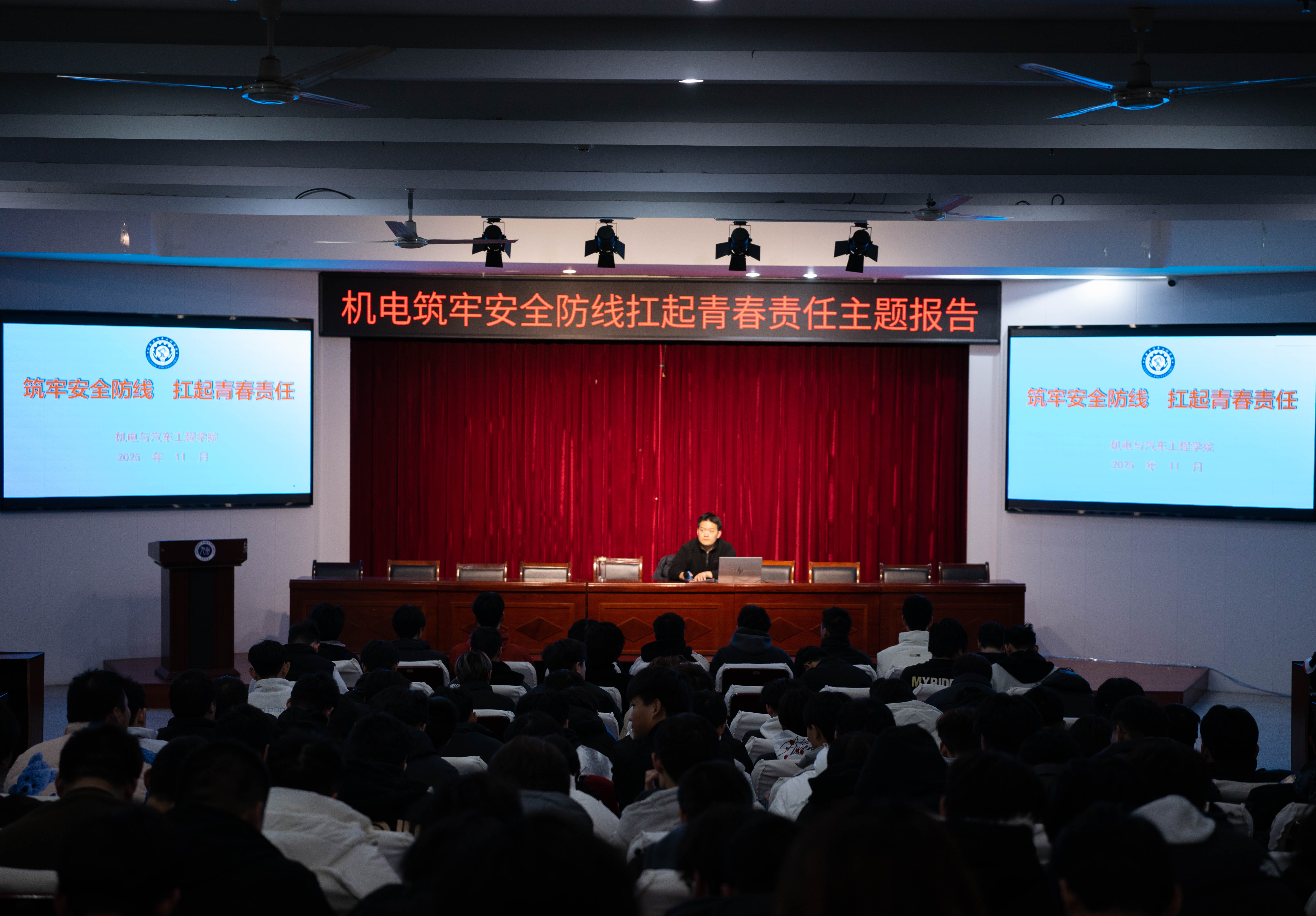 为全面提升学生安全意识,强化主体责任担当,推动校园安全文化建设,11月26日下午,机电学院于主南二举行“筑牢安全防线,扛起青春责任”校园安全教育主题报告。本次活动由辅导员冯星硕主讲,面向各年级学生代表与班委骨干,旨在凝聚安全共识,构建人人有责、人人尽责的校园安全共同体。