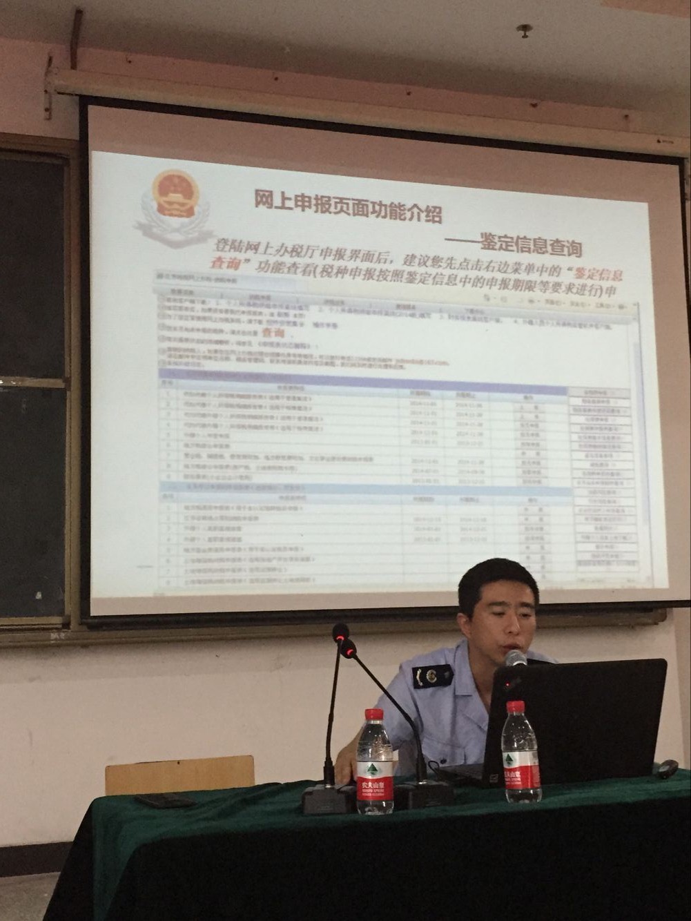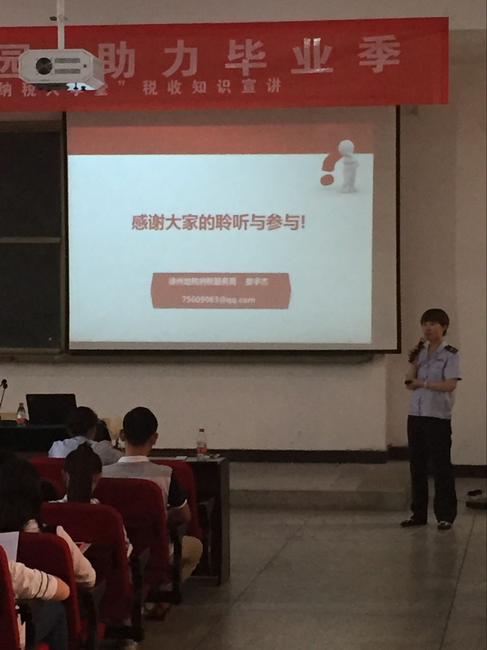 此次讲座共分为三个部分。首先由宣传咨询科娄科长就徐州地税工作职能、组织机构、业务范围、办税服务平台、地税投诉平台、徐州地税与其他部门职能交叉问题处理等六个方面做了详细的介绍。接下来,制度业务科高科长就徐州地税具体办税业务为大家进行了全面的介绍。他首先根据我国税法改革情况给同学们讲解了目前地税的具体征收范围以及营改增后地税业务变化情况,接着结合实际工作介绍了税务登记的程序、内容、所需资料以及TIPS协议签订方法和作用,最后,高科长还分别就企业所得税、个人所得税、房产税、城镇土地使用税、印花税等具体税种详细讲解了网上纳税申报流程。办税服务一科吕科长在最后为大家做了一节名为“用礼仪修养叩开多彩的人生之门”的礼仪讲座。吕科长结合工作和生活中的真实案例,主要从服饰礼仪、语言礼仪两个方面为大家上了一堂生动的礼仪课。