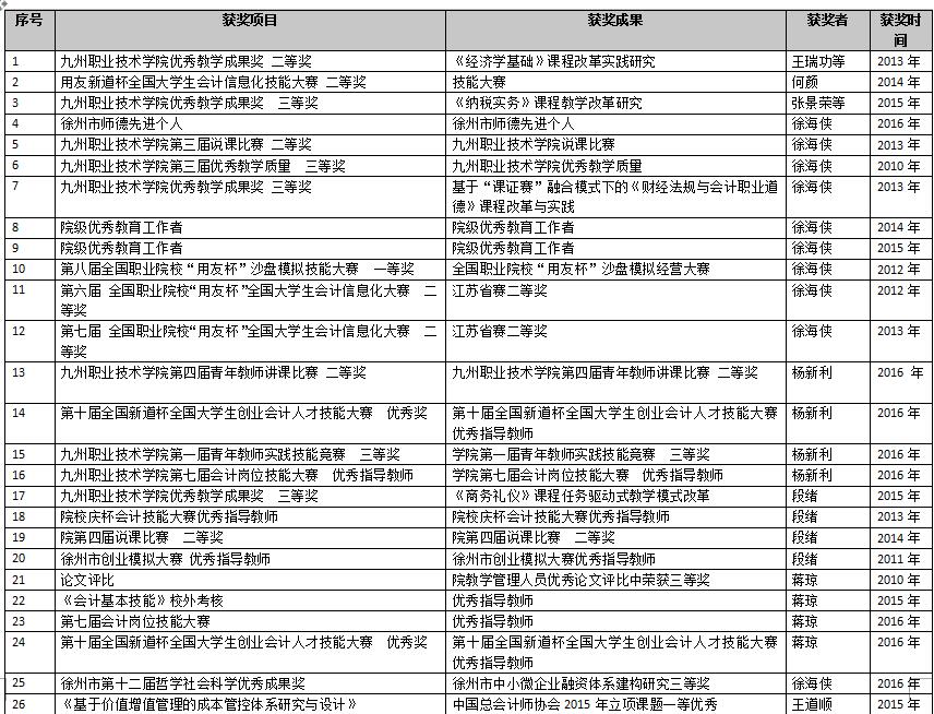 近三年来,团队共承担省级课题8项,市级课题6项,院级课题5项,院级重点课程4项;发表学术论文38 篇,主编、副主编、参编教材13部;共获得各类奖项26项,其中中国总会计师协会2015年立项课题一等优秀奖一项,省级以上技能大赛优秀指导教师3项;徐州市优秀社科成果奖1项;院级优秀教学成果奖3项;院级青年教师说课比赛二等奖3项。