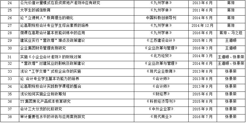 团队中具有研究生学历的共有8人;王道顺、张道响、张景荣、何颜、徐海侠等5人具有高级职称;王道顺、张道响具备高级会计专业技术资格;何颜、杨新利具备中级会计专业技术资格;双师型比例达到100%;4人确定为学院骨干教师培养对象。
