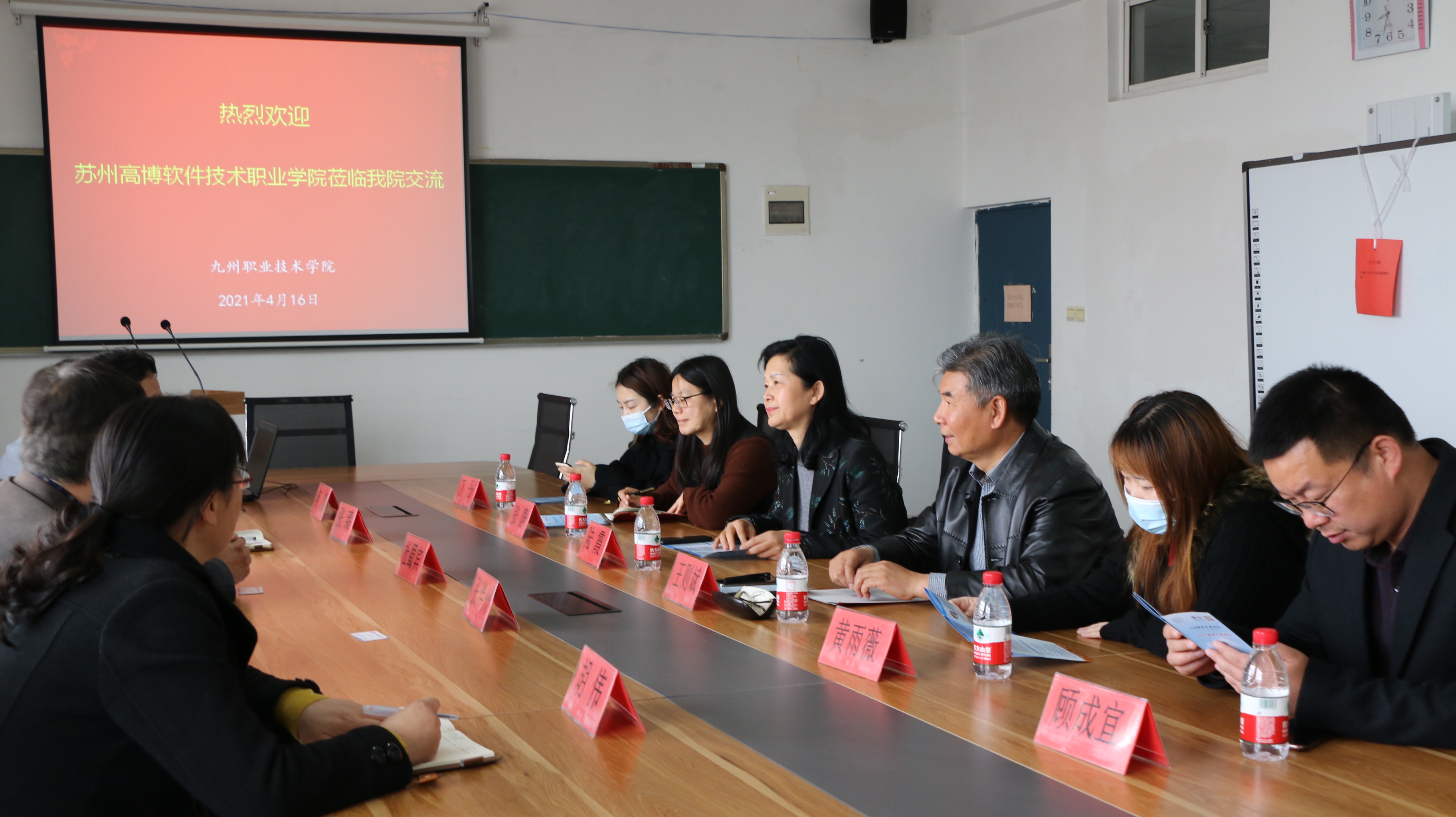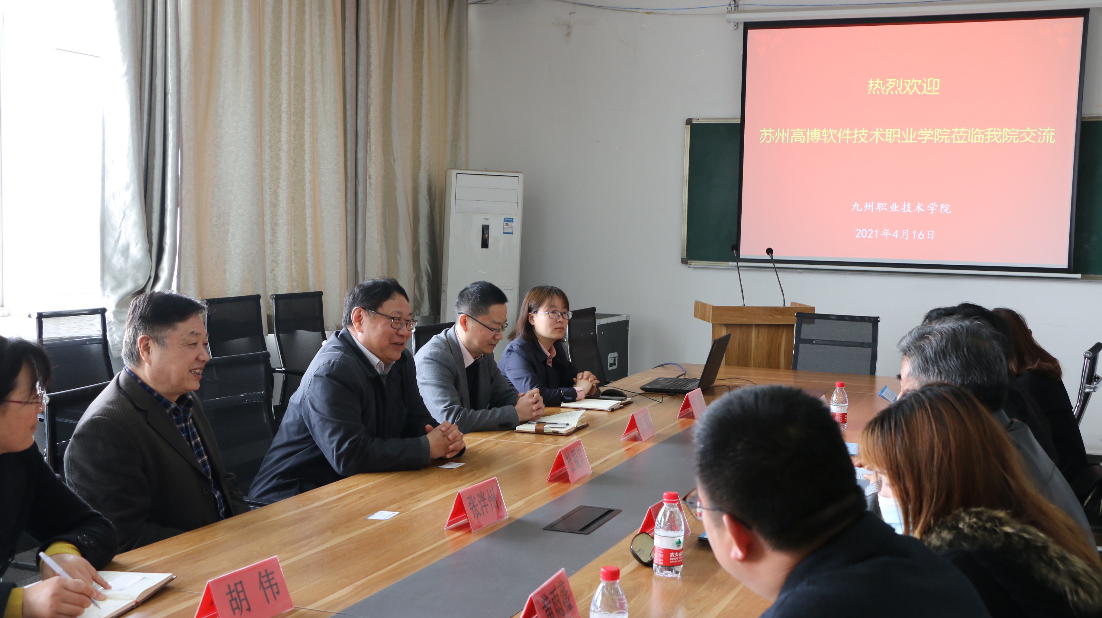 九州职业技术学院教学副院长杜蜀宾和苏州高博软件技术学院教务处长陆霞、商学院院长王则斌在专业建设、人才培养、学生就业等方面相互做了深入交流。苏州高博软件技术学院重点关注了我院在电子商务专业开展情况。经管系张泮州主任从校企合作、产教融合、学生就业创业人才的培养、孵化基地建设等方面向苏州高博软件技术学院做了详细讲解。他们希望今后能够学习我院在这方面的宝贵经验和做法。