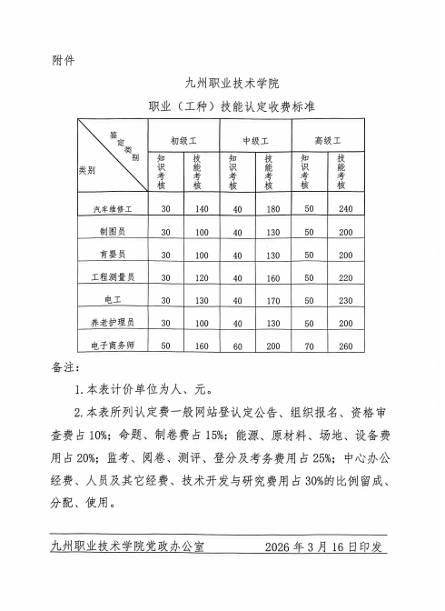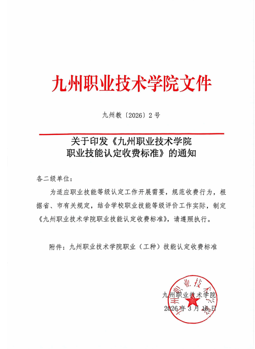 关于印发《九州职业技术学院职业技能认定收费标准》的通知