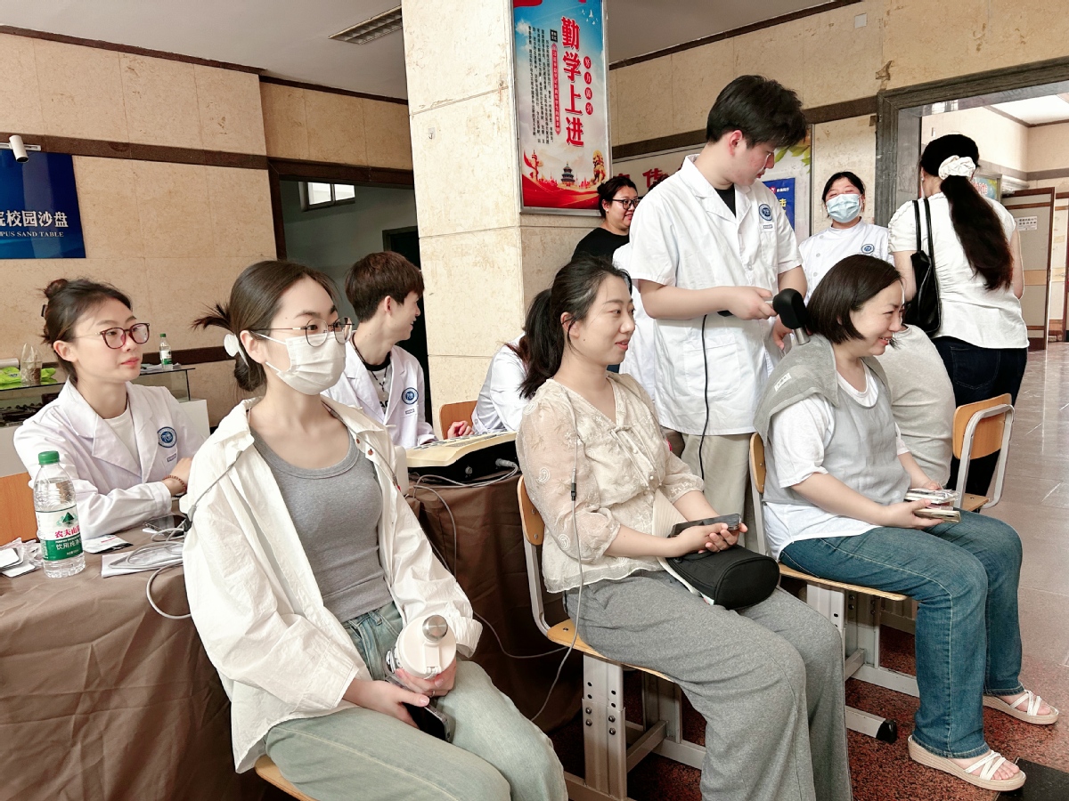 活动现场设置了中医理疗、艾灸体验、推拿按摩、血糖血压监测等多个体验区。在中医区,师生现场演示了电脑中频理疗“通经活络”的精准调节、艾灸疗法对穴位的温热传导、推拿手法对肌肉疲劳的有效缓解、耳穴埋籽调理机体平衡的全息疗法;现代理疗区重点展示了DMS深层肌肉刺激理疗仪等先进设备的应用,同时配套血压血糖监测与健康档案管理服务,形成“传统+科技”的现代康养服务体系。