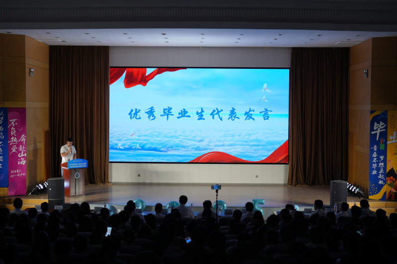 随后,毕业生代表机电与汽车工程学院潘星宇同学发言,深情回顾三年的校园生活,分享了大学期间的成长与收获,表达了对母校的感恩之情,并号召同学将个人理想融入国家发展,以行动践行担当。