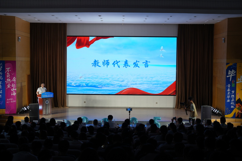 教师代表医疗与健康学院张秋显以“青春逐梦正当时”为题发言,寄语毕业生永葆热爱、终身学习,脚踏实地追逐梦想,心怀感恩勇担重任,如雄鹰翱翔、航船破浪,在新征程书写辉煌。