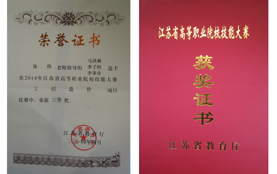 为加快推进我院工程造价专业教育改革,不断提高学生实践能力和创新能力,提升人才培养质量。4月25-27日,我院参加了由江苏省教育厅在江苏建筑职业技术学院举办的全省高等职业院校首届工程造价技能大赛。本次工程造价技能竞赛既是全省高等职业院校技能大赛赛项之一,也是选拔参加全国工程造价技能竞赛代表队的预选赛,共有全省24所高职院校参加。本次工程造价技能大赛的方式分为手工工程量计算、创新工程量计算和软件工程量计算三个方面,每种竞赛方式的内容均包括土建、装饰和安装三个方面的知识,具有考查知识面广,考查难度深,考查技能水平高和竞争激烈等四大特点。接到比赛通知后,土木工程系袁文主任非常重视此次比赛,并及时部署相关工作,并指示由教学副主任张伟老师亲自带队参赛。接到任务后张伟老师积极行动起来,组建了张伟老师任队长,杨署华老师为培训人员,以李事业、马洪林、李子恒三位同学为培训对象的参赛队伍,先后开展了大量的培训工作。比赛期间张伟老师不断鼓励同学不要紧张,要仔细认真,更要放松心态。选手们也沉着应战,发挥出了他们的正常水平,并最终取得了大赛三等奖的好成绩,指导教师张伟老师也同时荣获优秀指导教师。