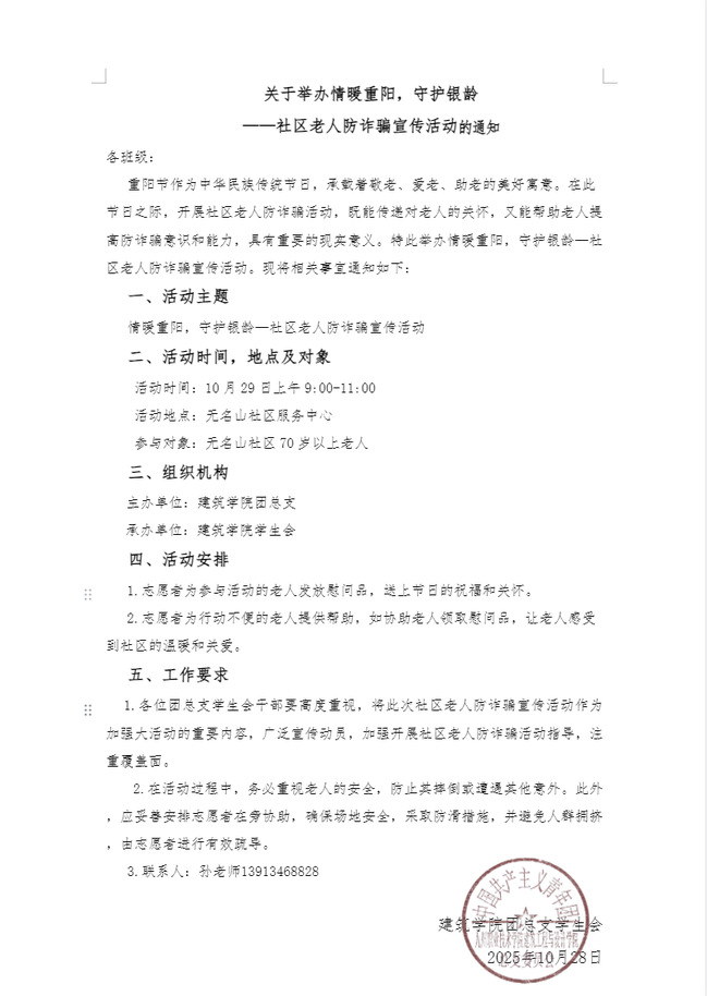 关于举办情暖重阳,守护银龄 ——社区老人防诈骗宣传活动的通知