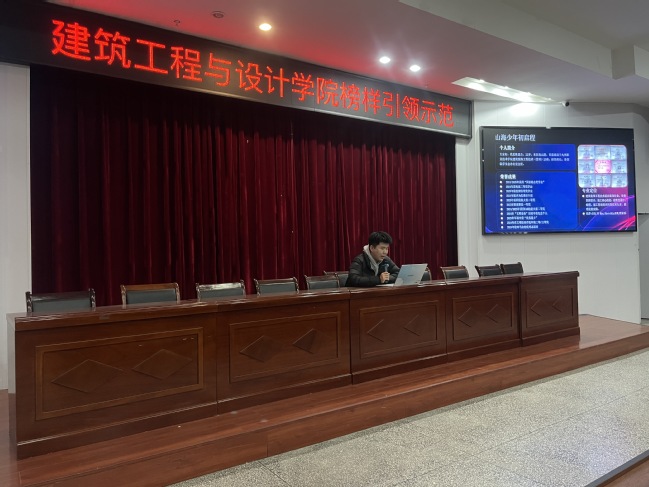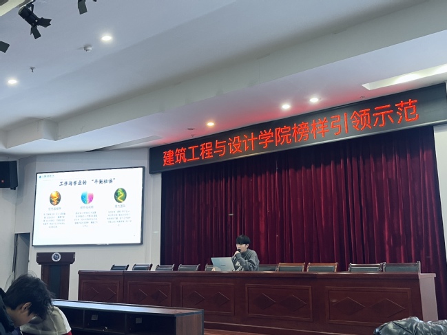 为充分发挥榜样的示范引领作用,激发建筑学院学子的学习热情与奋斗动力,11月27日晚19点,建筑学院于主南二报告厅举办榜样引领示范讲座。此次讲座邀请了3位在学业、班级建设、社会实践等方面表现优异的优秀学子作为榜样代表,他们分别是:建筑消防技术23级国家奖学金获得者徐梓桐、工程造价23-2班(红旗先进班集体代表)刘莹莹,以及建筑装饰工程技术(景明)23级实践先锋陈恩杰。