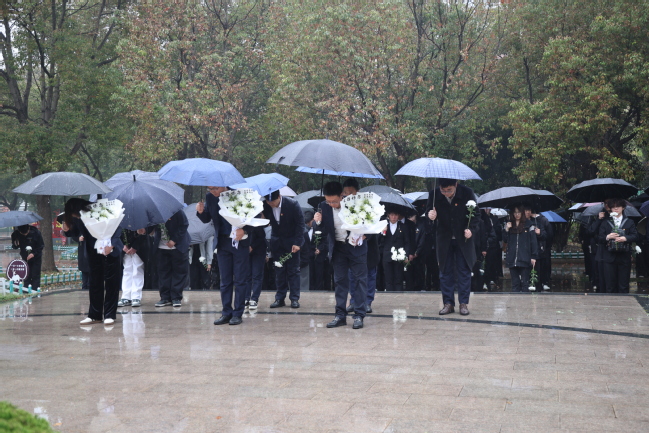 雨势未减,全体师生前往徐州淮海战役纪念塔开展祭扫活动。机电学院党支部副书记丁鹏介绍了淮海战役的历史意义,阐释了人民战争的伟大力量和革命先烈坚定信仰、无私奉献的精神。全体人员肃立默哀、行三鞠躬礼,师生代表依次敬献鲜花,在庄重氛围中寄托对革命先烈的深切缅怀与崇高敬意。