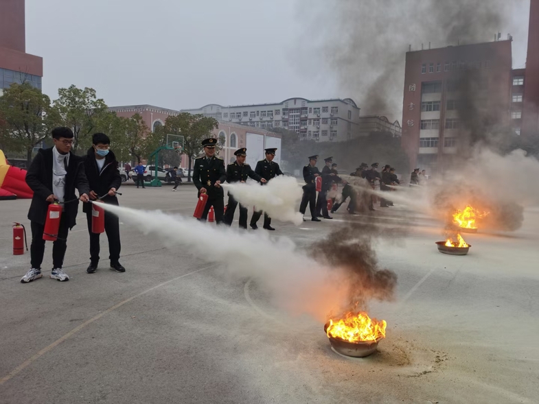灭火实践环节,于教官就干粉灭火器的正确使用方法进行了现场讲解、示范、指导,强调使用灭火器要保持镇静,遇到火情千万不要慌乱失措,牢记“一晃、二拉、三压、四喷” 要领,掌握正确的使用方法,提高自救自护能力。全校50余老师、学生干部参加了实践。