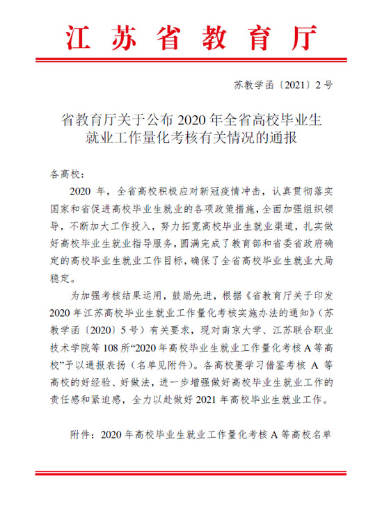 根据《关于印发2020年江苏高校毕业生就业工作量化考核实施办法的通知》(苏教学函〔2020〕5号)文件要求,2020年省教育厅开展了全省高校毕业生就业工作量化考核工作,我院在本次考核中喜获A等级,并受到省教育厅通报表扬。