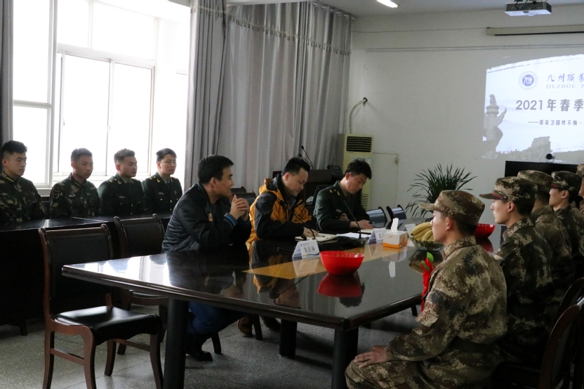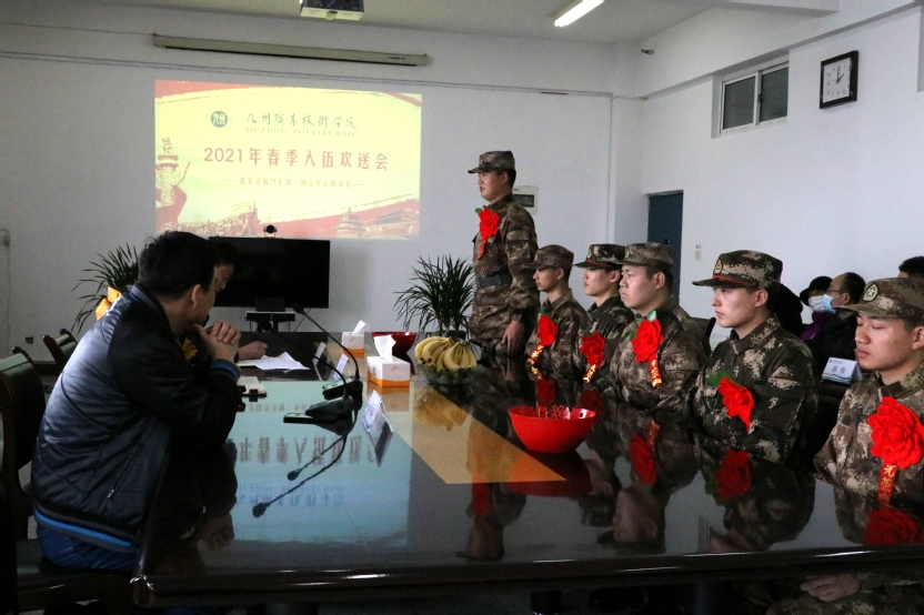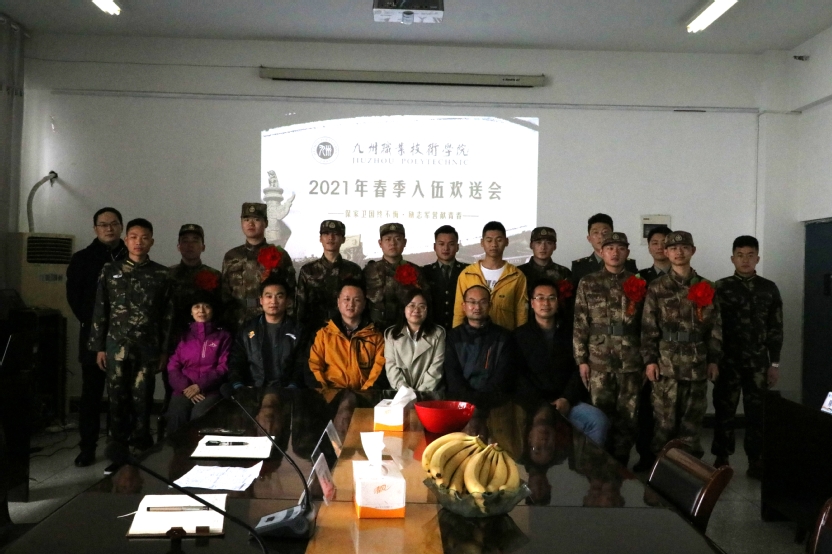 换上军装、背起行囊,莘莘学子携笔从戎。3月15日下午,九州职业技术学院在主楼913召开2021年春季入伍大学生欢送会,欢送今年即将踏上建设国防、保家卫国征途的新兵们。纪委书记、院长助理张超、学院武装部部长朱存各、各系院相关辅导员老师、入伍新兵以及优秀退役大学生士兵代表共同出席此次会议。![]()