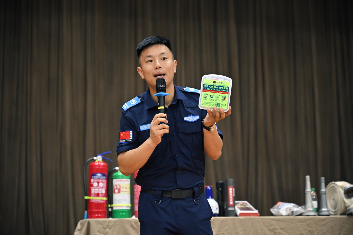16 时整,消防专题讲座接续进行,一营、四营新生参与其中。徐州民安防火培训中心教官、专业消防讲师胡青龙,以近年高校火灾事故为警示,剖析了违规用电等引发火灾的主要原因。现场,胡教官讲解了火灾预防措施、火场逃生 “黄金三分钟” 原则,以及防毒面具、灭火器、消防栓等消防器材的正确使用方法。现场还通过实物演示、互动问答等形式,帮助新生巩固知识,解答疑问,最后主持人对培训重点进行总结,确保消防知识真正融入新生认知。