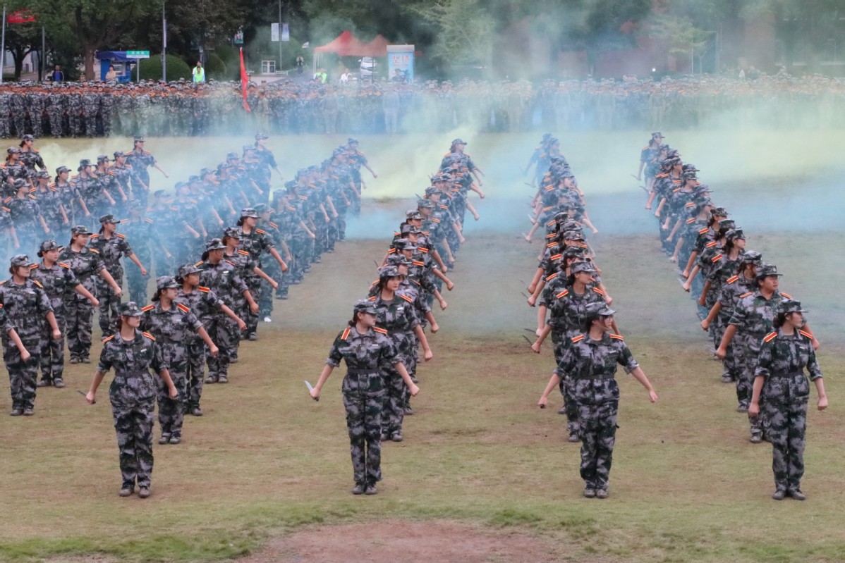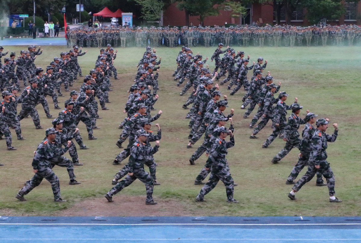 军训成果汇报表演环节,5个营、59个连队的新生集体亮相,嘹亮口号响彻训练场。队列方阵踏正步过检阅台,横竖成线、进退有序,每一个转体与摆臂都凝聚14天烈日下的打磨,尽显军人姿态;女子匕首操方阵动作刚毅,诠释“巾帼不让须眉”的坚韧;男子军体拳方阵拳法凌厉,满是铁血豪情。新生们将“不怕苦、不怕累”的精神展现得淋漓尽致,赢得阵阵掌声。