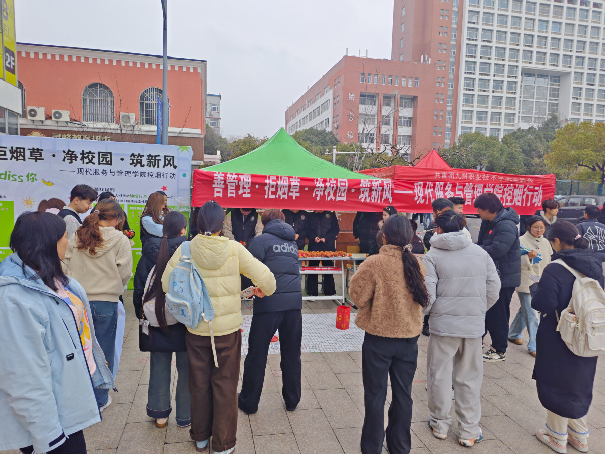 为积极营造健康文明的无烟校园环境,强化师生控烟禁烟意识,规范校园文明行为,近日,现代服务与管理学院组织的“善管理·拒烟草·净校园·筑新风”控烟主题活动在美食广场门口举办,师生踊跃参与,以趣味互动的形式传递禁烟理念,共筑无烟校园。