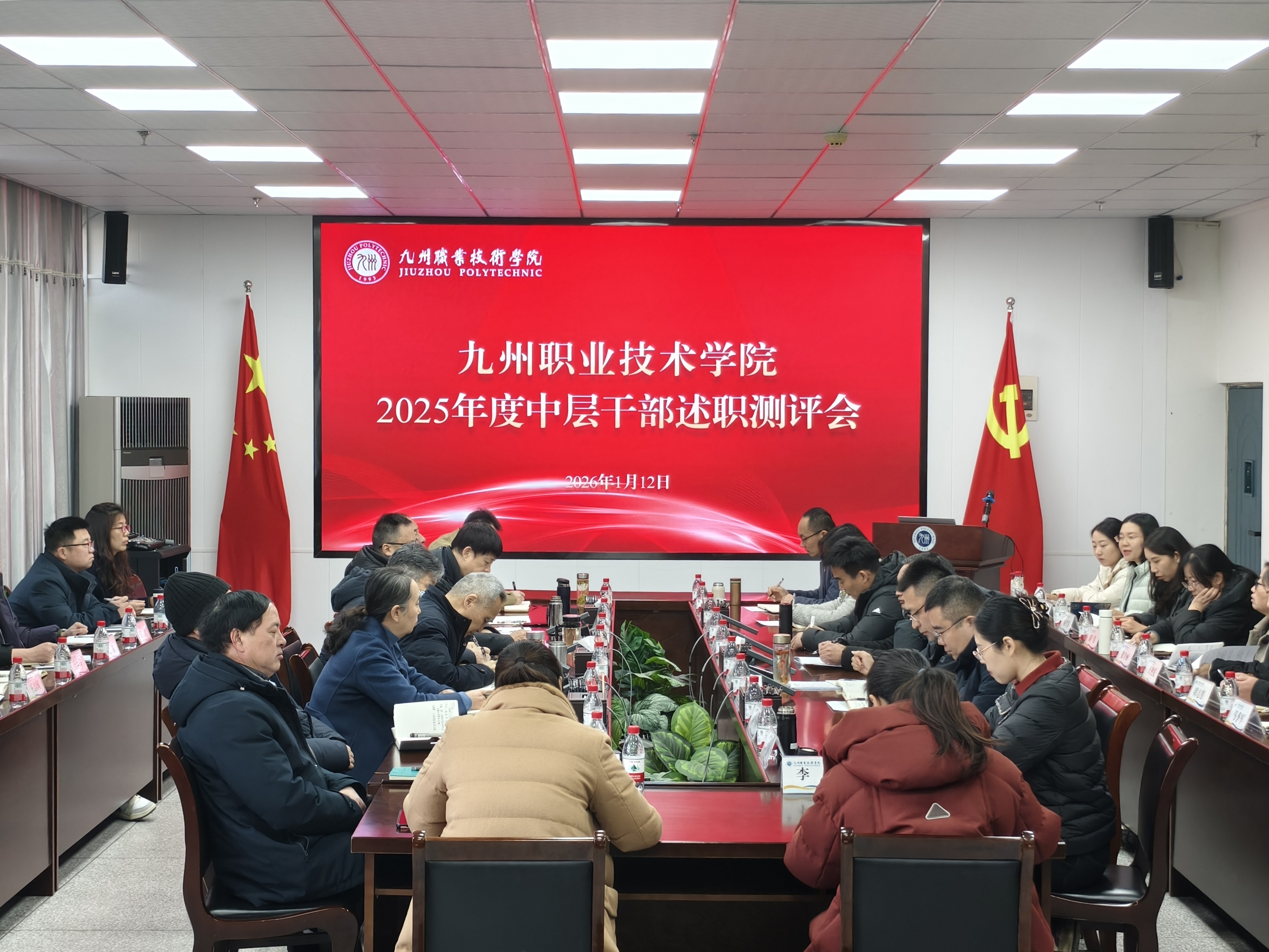 为全面客观考评全体中层干部履职情况,2026年1月12日,我校举行2025年度中层干部述职测评会。校党政领导、全体中层干部以及各二级单位教职工代表参加会议。述职环节,各中层干部紧扣思想政治表现、2025 年度主要工作成效与亮点、存在不足及整改措施、2026年重点工作计划等核心内容展开汇报,同时对照本单位年度工作任务及《目标责任书》要求,客观总结履职实绩。其中,中层干部正职还将本单位意识形态责任制、安全生产责任制、保密...