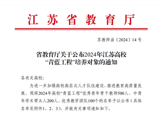 2024 年江苏高校“青蓝工程”优秀青年骨干教师名单(文件截图) |
